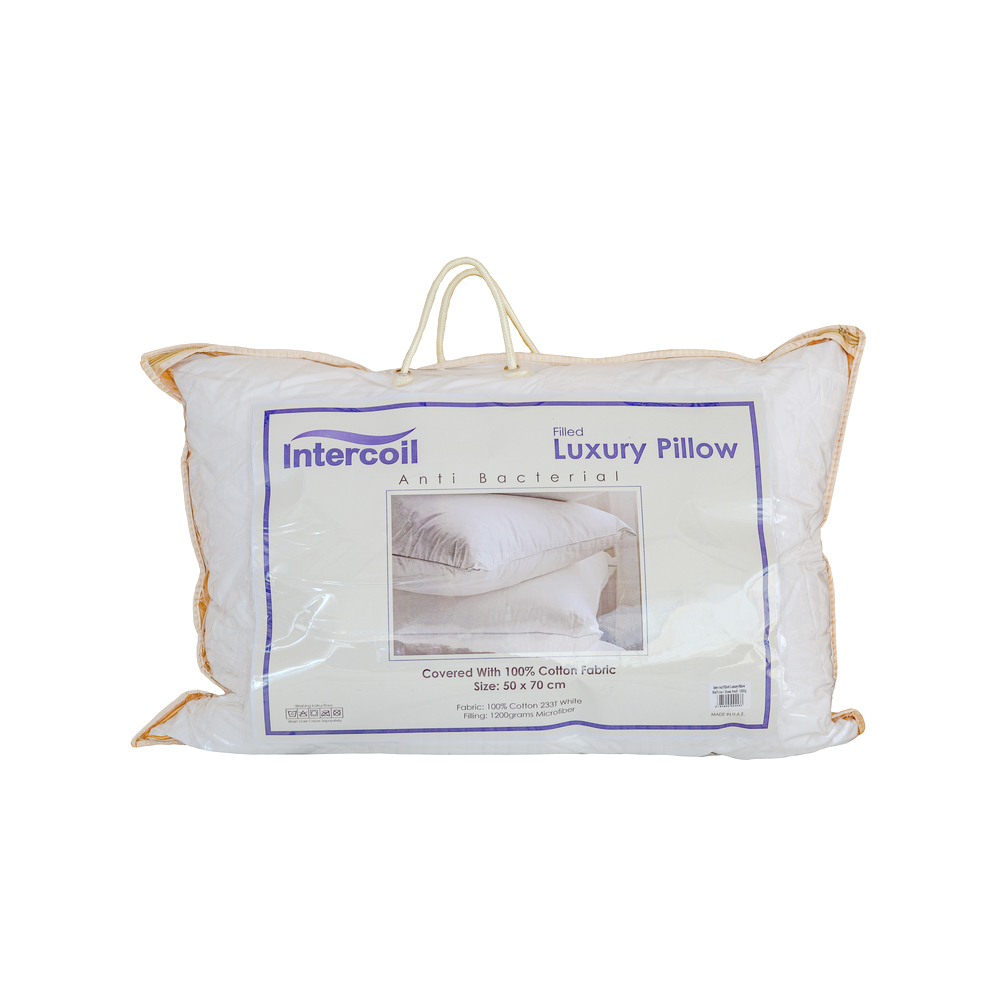 "Wake up feeling refreshed with the Intercoil® Filled Luxury Pillow. Constructed of plush microfiber expertly made with 1200 grams with its needle stitched gold satin cord bring a streamlined luxurious look. Its breathable, easy to clean and maintain. This pillow is very lightweight, static free, will not fade and also will hold their shape for a long time. Dimensions 50x75"